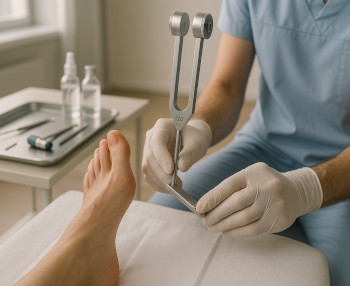 Оценка нейропатии проводится с использованием камертона градуированного на 128 Гц для определения вибрационной чувствительности, монофиламента Семмеса-Вайнштейна весом 10 грамм для тактильной чувствительности, неврологического молоточка для проверки ахиллова и коленного рефлексов, набора игл для оценки болевой чувствительности. Вибрационная чувствительность считается сниженной при восприятии вибрации менее четырех секунд на уровне первого пальца стопы, отсутствие ощущения прикосновения монофиламента в четырех из десяти точек подошвенной поверхности свидетельствует о защитной нейропатии с высоким риском язвообразования. Электронейромиография выполняется для количественной оценки скорости проведения импульса по нервам нижних конечностей, снижение показателей ниже 40 метров в секунду указывает на тяжелую степень нейропатии.